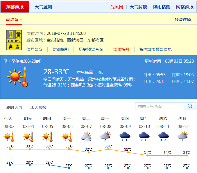 近期天氣方面,預(yù)計3日多云間晴天,天氣酷熱,局地有短時陣雨或雷陣雨,氣溫27-33℃,北部和人口密集區(qū)局地最高氣溫可達35℃;4-7日多云,局部有短時(雷)陣雨。請注意持續(xù)高溫下的防暑降溫和戶外活動、戶外作業(yè)的安全;關(guān)注局地雷雨的影響,發(fā)布雷電預(yù)警時,需遠離高山、開闊的地方以及樹下、較淺的山溝或者山洞、水面等地區(qū)。