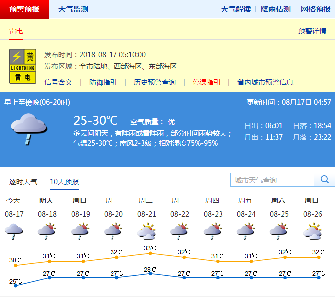 深圳新聞網(wǎng)訊(記者 施冰冰)深圳市氣象臺預(yù)計(jì),17日深圳多云間陰天,有陣雨,部分時間雨勢較大,氣溫26-30℃;18-19日多云,間中有陣雨或雷陣雨;20日起陽光增多,偶有短時陣雨,天氣趨于炎熱。