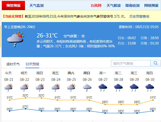 據(jù)深圳氣象臺(tái)預(yù)計(jì),21日~22日,深圳多云,局地易出現(xiàn)雷陣雨,風(fēng)力持續(xù)微弱,部分時(shí)間還有輕霧或霾,能見度較差。其中,21日早晚濕度大,有輕霧,中午以后濕度有所下降,大部分地區(qū)輕霧會(huì)轉(zhuǎn)成輕度灰霾。