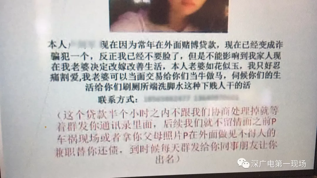 今天上午,記者在龍崗坪地一小區(qū)外見到了盧先生,他告訴記者,最近手機收到這樣一張圖片,圖片恰巧是他的一位女性朋友頭像,下面還配上一些關(guān)于“幫盧先生還債”的不實文字信息,內(nèi)容是盧先生已經(jīng)成了詐騙犯,現(xiàn)在正在當(dāng)“洗腳妹”幫盧先生還賬,圖片上還有盧先生的個人資料和電話號碼。