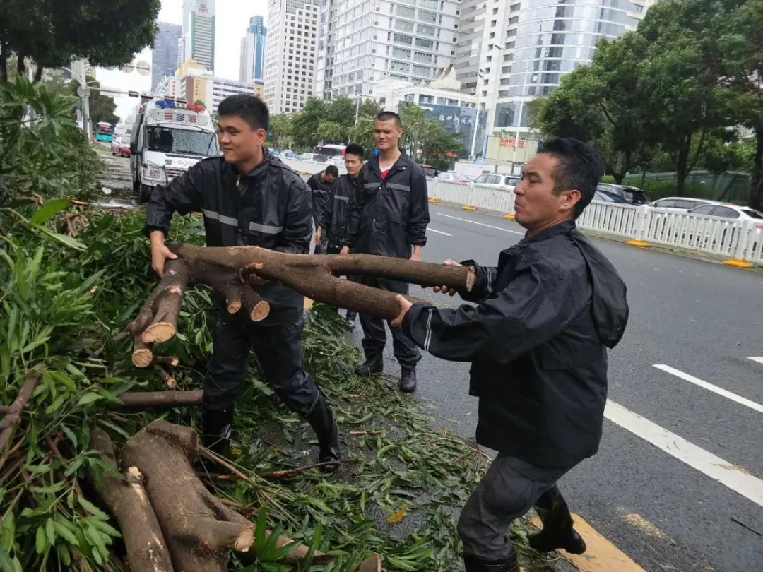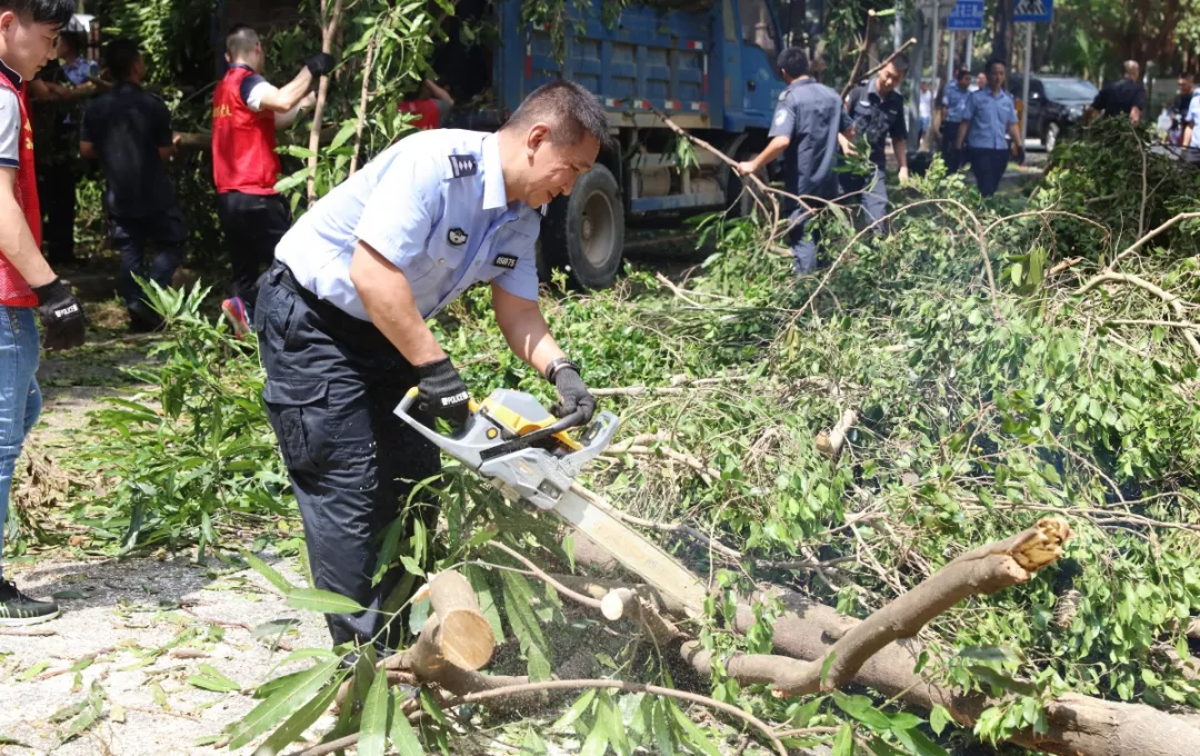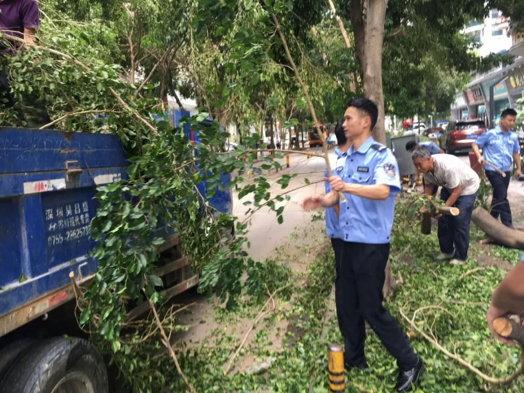 9月19日上午,福田區(qū)百花二路、三路,60多名身著藍色制服的警察和紅色馬甲的輔警格外顯眼,他們正在揮汗如雨地進行災后路障清理工作。