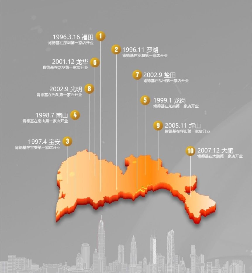 2007年,是深圳的大年份,也是肯德基的大年份。2007年,深圳人均GDP達到10684美元,首次超過1萬美元。肯德基的開店數(shù)量也在那一年突破了100家,達到108家。同時,肯德基完成了對現(xiàn)在深圳十區(qū)的開店布局。