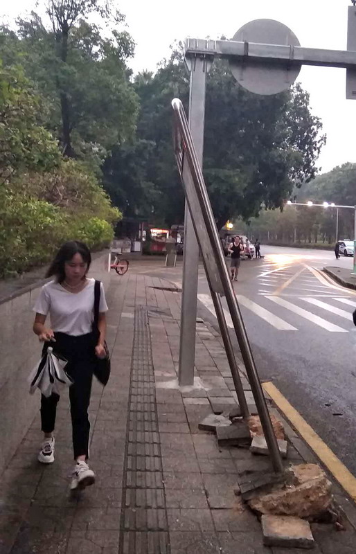 存在安全隱患的不僅電線桿,記者在蓮花山公園附近一人流量較大的十字街頭發(fā)現(xiàn),有一塊交通路牌也被“山竹”吹的東倒西歪,其底部根基已經(jīng)翻出一半,讓人擔(dān)心其會(huì)隨時(shí)倒下、危及過往路人安全。“我每天上下班都會(huì)經(jīng)過這里,騎著車又不得不走路牌內(nèi)側(cè),每次都有點(diǎn)小怕,擔(dān)心牌子會(huì)突然倒下砸到我?!备浇木用裣蛴浾咄虏鄣馈?/p>