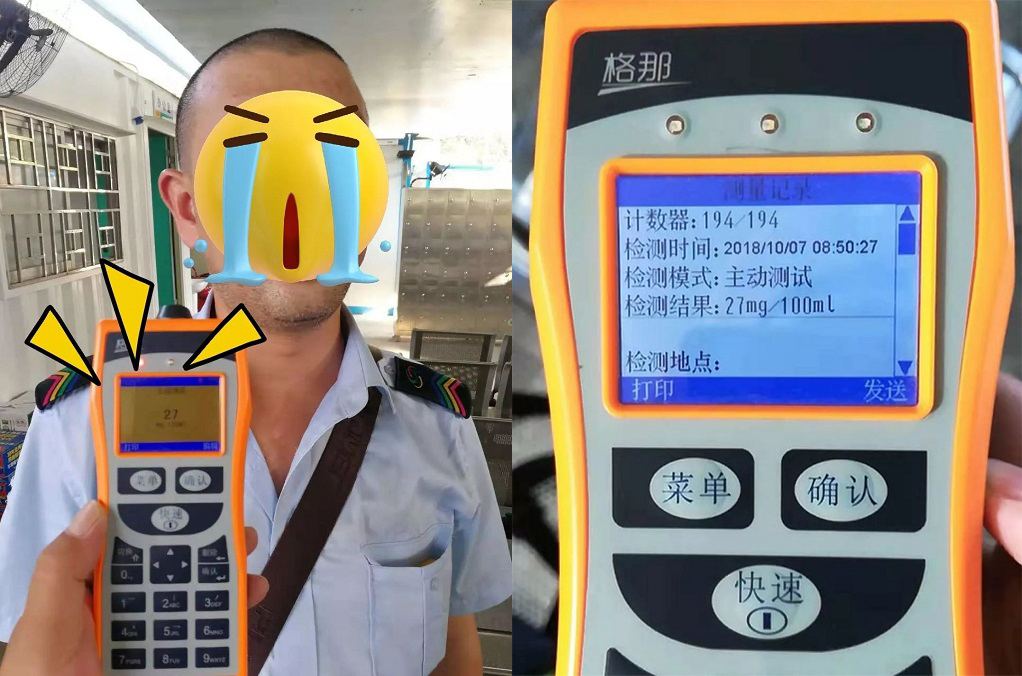 深圳交警到達現(xiàn)場后,再對何某平進行現(xiàn)場主動式酒精測試儀檢測,結(jié)果顯示其酒精測試值顯示為27mg/100ml,達到酒后駕駛的標準。