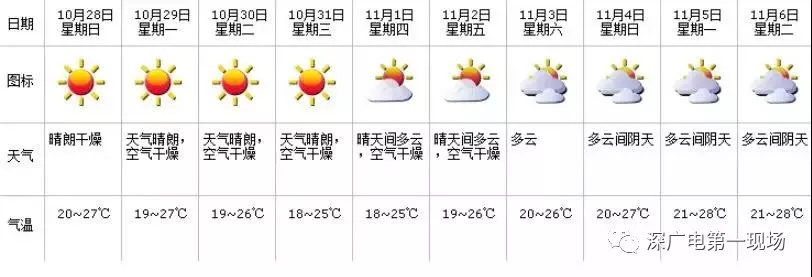 28日到11月1日持續(xù)晴朗干燥,28日氣溫20-27℃;11月2日起云量逐漸增多?;痣U(xiǎn)預(yù)警信號(hào)將持續(xù)生效,建議做好防火安全管理。