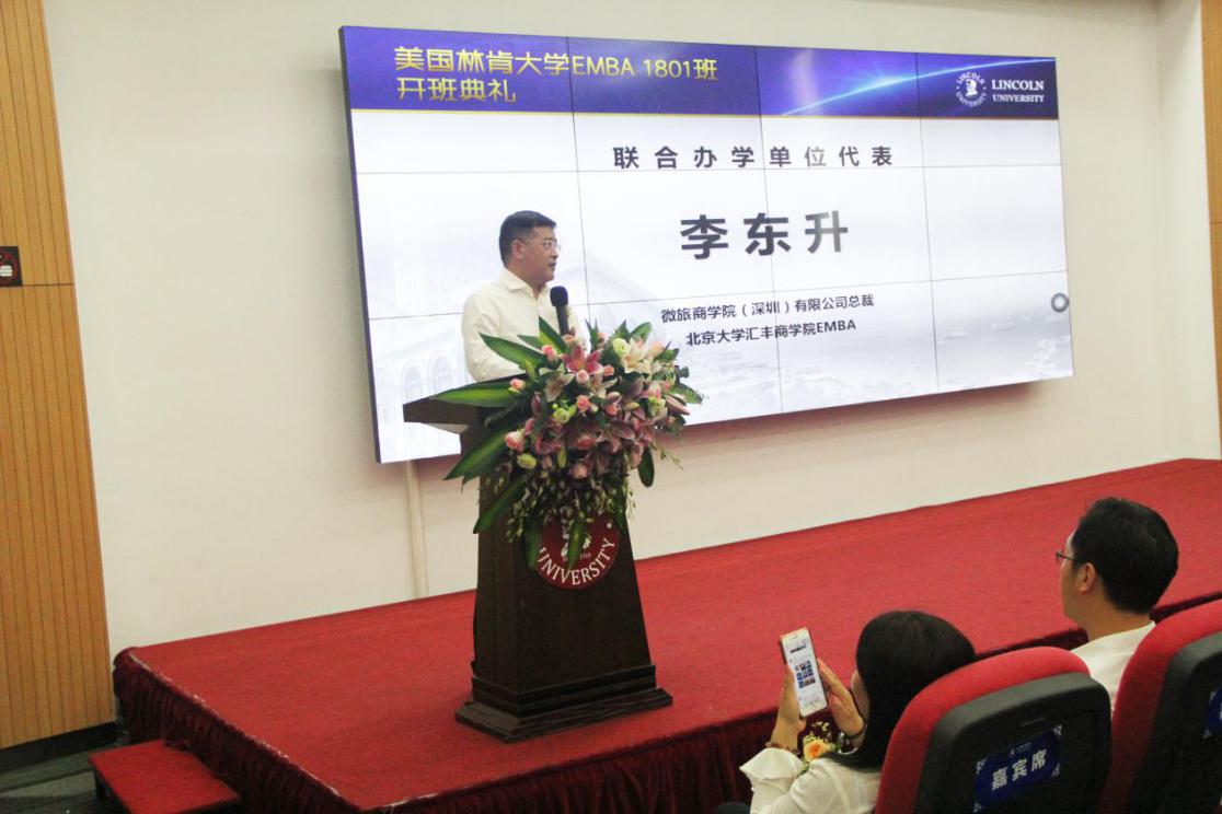 美國林肯大學(xué)的發(fā)展也離不開合作辦學(xué)單位的支持,聯(lián)合辦學(xué)合作單位代表李東升先生,分享了他就讀EMBA的心得,同時(shí)也對新教育的理念、新時(shí)代企業(yè)發(fā)展的模式提出了自己的見解。
