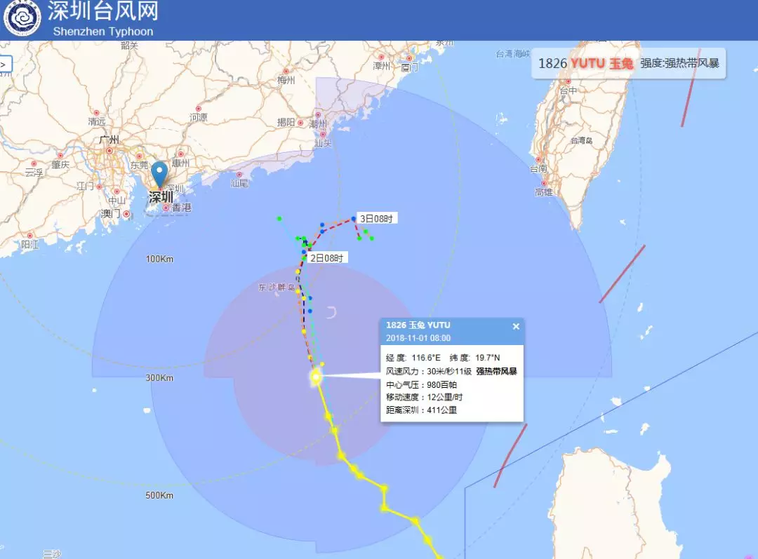 11月1日上午08時(shí)臺(tái)風(fēng)“玉兔”位于距離深圳411公里的南海海面上,其中心附近最大風(fēng)力11級(jí)(30米/秒),預(yù)計(jì)臺(tái)風(fēng)“玉兔”將以12km/h的速度緩慢北行,2日強(qiáng)度明顯減弱。