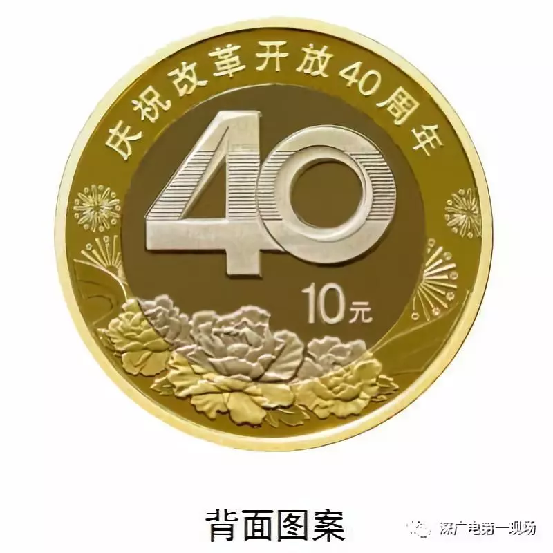 雙色銅合金紀念幣背面主景圖案為阿拉伯數字“40”,背景圖案為牡丹花、飄帶和禮花。主景圖案上方刊“慶祝改革開放40周年”字樣,右下方刊面額“10元”字樣。