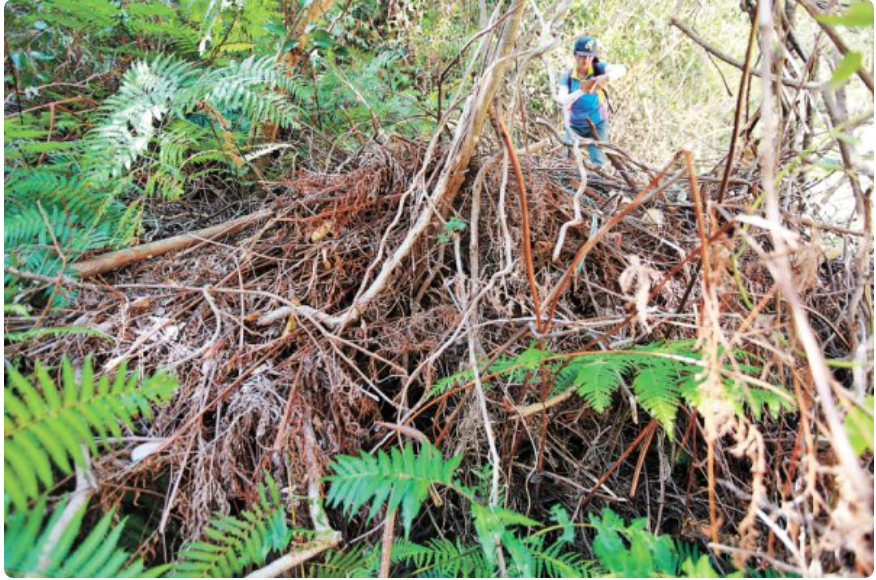 山谷中一個長約50米、寬約30米的采石現(xiàn)場赫然出現(xiàn)在眼前。大量碎石被整齊碼放在山坡上,在溪水流經(jīng)的兩塊巨石上,散落著幾根鋼筋撬棍、幾把小鐵錘,還有一些塑料刷子和手套。在現(xiàn)場西側(cè)的一片小樹林下,堆放著十幾根被鋸斷的樹干,走近一看,樹干里放著鋼鋸等工具。在樹干上方,則是一堆用塑料繩捆扎好的、已經(jīng)枯黃的藤類和蕨類植物,經(jīng)辨認,這里有相當一部分是國家二級保護植物"金毛狗"。此外,在采石現(xiàn)場北側(cè),可以看到一些還沒有被挖掉的蕨類植物,這些則是幸免于難的殘存"金毛狗"。