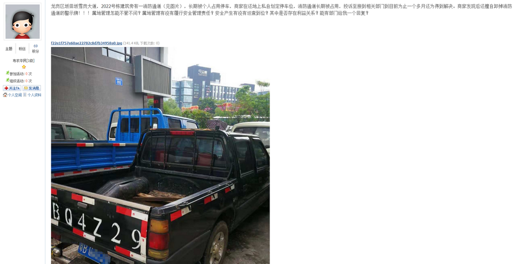 深圳新聞網(wǎng)11月22日訊(記者劉婷)隨著私家車數(shù)量的增多,停車越來越難,而亂停車的現(xiàn)象也日益增多。近日,有網(wǎng)友“hepingshijie”在深圳論壇發(fā)帖吐槽,坂田坂雪崗大道2022號棟建筑旁一消防通道,長期被私家車占用,存在嚴重的安全隱患。(網(wǎng)帖地址:https://szbbs.sznews.com/thread-3823312-1-1.html)