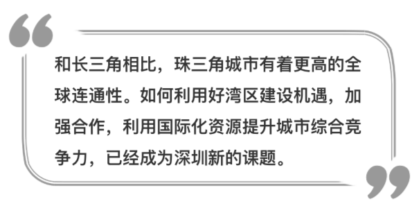 一方面,深圳要開(kāi)展更大范圍、更高水平、更深層次的全球合作,提升在全球網(wǎng)絡(luò)中的地位和能級(jí),增強(qiáng)對(duì)經(jīng)濟(jì)資源要素的配置能力,加深與全球市場(chǎng)的融合程度。另一方面,深圳也應(yīng)從本土優(yōu)勢(shì)和特色出發(fā),進(jìn)一步融入國(guó)家開(kāi)放格局,構(gòu)筑良性的城市-腹地關(guān)系,培育內(nèi)生的經(jīng)濟(jì)、產(chǎn)業(yè)、設(shè)施、資源等支撐體系,通過(guò)區(qū)域協(xié)同發(fā)展,增強(qiáng)全球競(jìng)爭(zhēng)力。