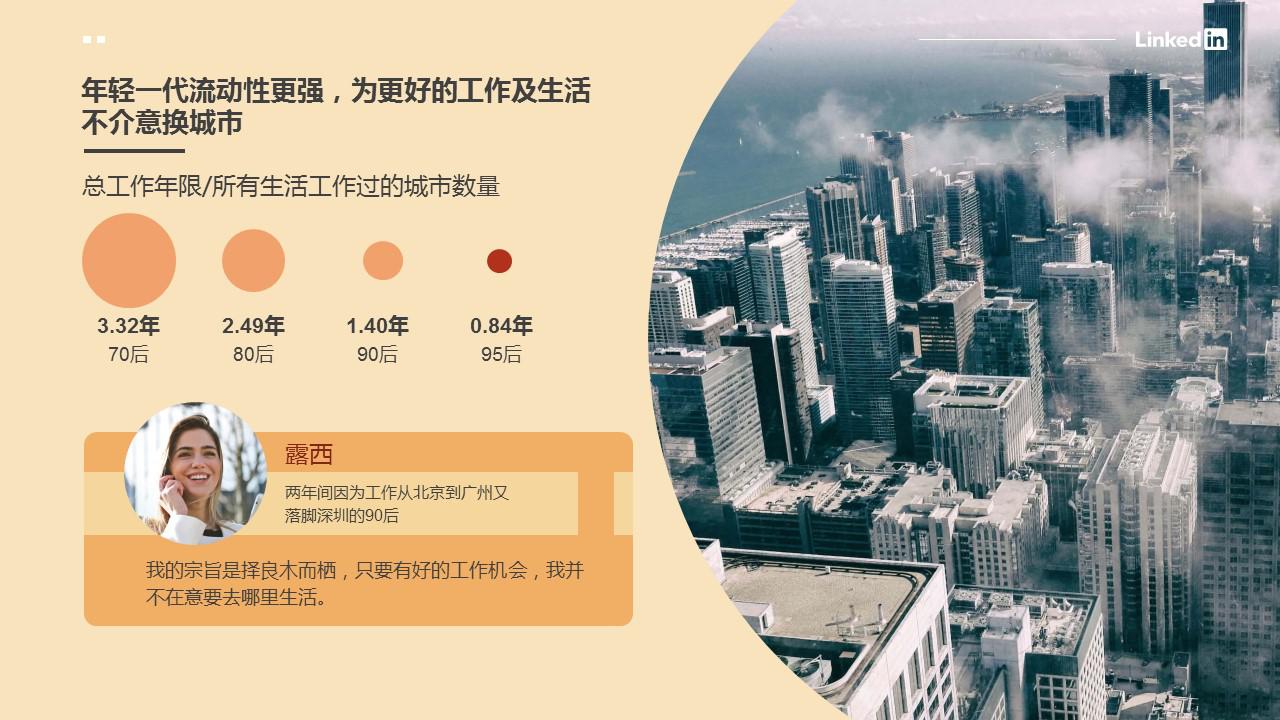 不論是因?yàn)楦玫墓ぷ鳈C(jī)會(huì)還是更理想的生活方式,新一代90/95后職場(chǎng)人都表現(xiàn)得更加勇敢和有魄力,“不將就”或許是他們最好的代名詞。畢業(yè)兩年間已經(jīng)經(jīng)歷從北京跳到廣州、又最終落腳深圳的90后露西表示:“不論是工作還是生活的城市,我都不會(huì)給自己太多限制,根本的原則就是擇良木而棲?,F(xiàn)在許多城市對(duì)年輕人有很多利好政策,工作機(jī)會(huì)也很多,我也想多嘗試一些不同的選擇,年輕的時(shí)候就應(yīng)該多嘗試?!?/p>