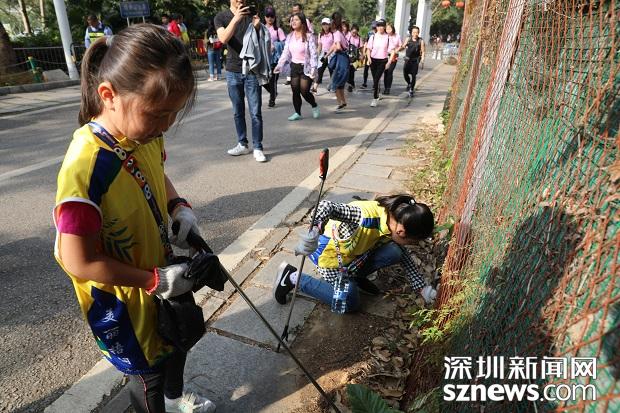 小朋友們也加入行動(圖為一小朋友彎腰拾取縫中的垃圾)