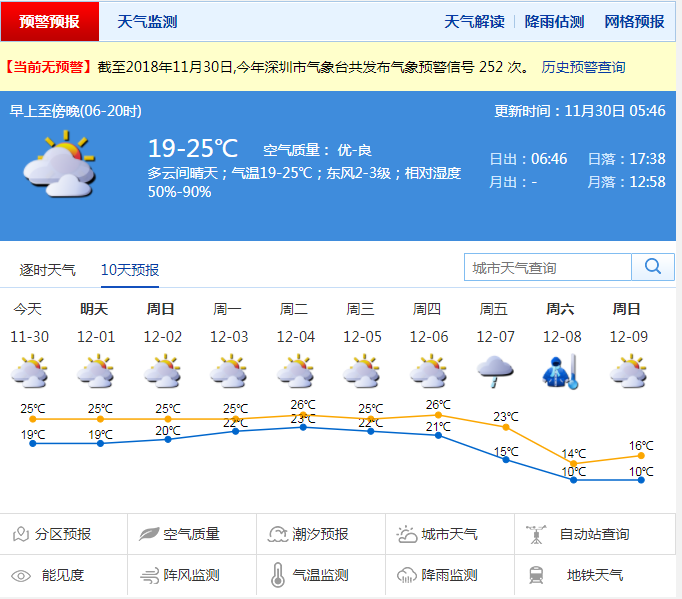 深圳新聞網(wǎng)11月30日訊(記者 施冰冰)29日多云間晴天;18-25℃;東風(fēng)2-3級(jí);濕度50%-90%。12月1-2日多云可見(jiàn)陽(yáng)光,早晚有輕霧;3-6日多云間陰天,偶有零星小雨。展望7-8日,受冷空氣影響,北風(fēng)明顯增大,天氣轉(zhuǎn)冷。