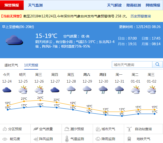 深圳新聞網(wǎng)2018年12月24日訊(記者 施冰冰)記者通過市氣象局了解到,深圳今天陰天間多云,有分散小雨;氣溫17-21℃;東北風(fēng)3-4級,沿海和高地最大陣風(fēng)6-7級;相對濕度65%-95%。