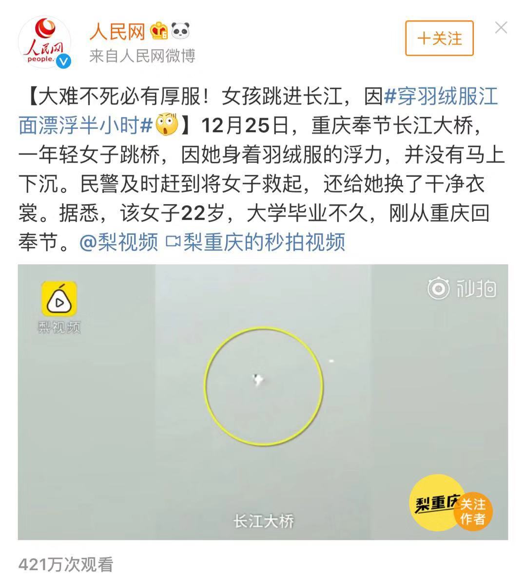 重慶有個(gè)22歲的姑娘跳長(zhǎng)江尋短見(jiàn),因身上羽絨服的浮力在江上漂浮了近半小時(shí)