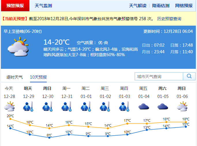深圳市氣象局預(yù)計(jì),12月28日受冷空氣前鋒影響,我市多云間晴天,風(fēng)力加大,沿海和高地最大陣風(fēng)7-8級(jí),氣溫下降,早晚清涼;29日-元月2日受冷空氣主體影響,氣溫顯著下降,天氣持續(xù)寒冷,最低氣溫在8℃左右,伴有7-9級(jí)陣風(fēng),間中有小雨。寒冷天氣將持續(xù)5-6天。