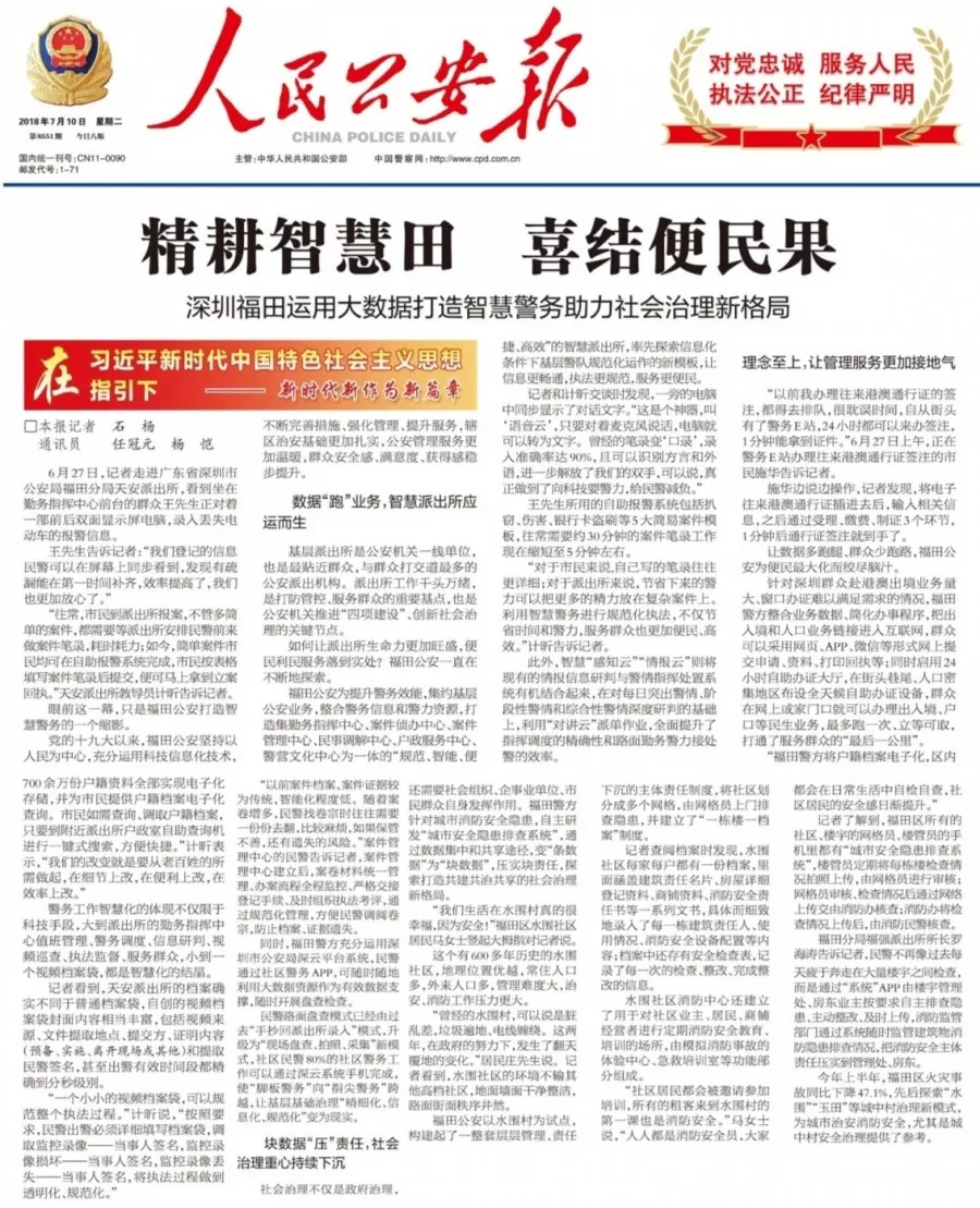 ★★進(jìn)入新時代,福田公安用信息化手段不斷強化管理、創(chuàng)新服務(wù)、提升效能,一件事情接著一件事情辦,不斷滿足群眾最關(guān)心最直接最現(xiàn)實的需求,讓數(shù)據(jù)多跑腿、群眾少跑路,打通服務(wù)群眾的“最后一公里”。