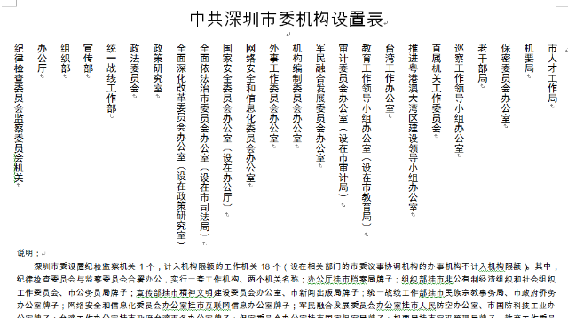 ①近日,《深圳市機構改革方案》經(jīng)省委、省政府批準,并報中央備案同意。1月8日至9日,市委召開六屆十一次全會,對全市深化機構改革工作作出全面部署,我市機構改革工作進入全面實施階段。深圳市委設置紀檢監(jiān)察機關1個,計入機構限額的工作機關18個(設在相關部門的市委議事協(xié)調(diào)機構的辦事機構不計入機構限額)。深圳市人民政府設置工作部門34個。詳情請看>>