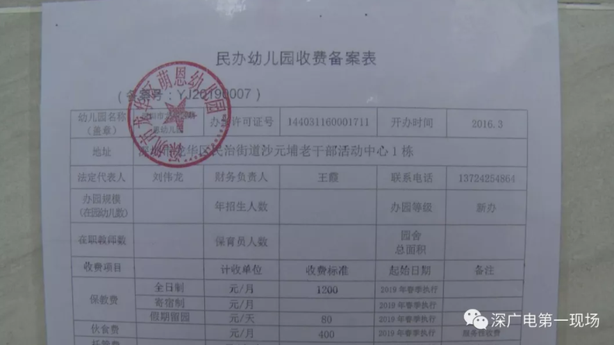 對此,龍華教育主管部門回復:2016年3月同意萌恩幼兒園設立;2018年7月該園取得民辦非企業(yè)單位登記證書的辦學資質(zhì),2018年12月向教育局申請了收費備案;2019年1月批復同意他們的收費標準。