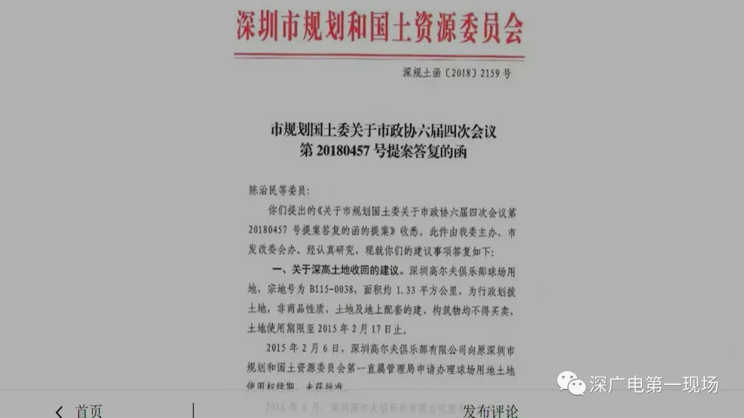 陳治民的提案,在去年獲得了深圳市規(guī)劃國土委的回復(fù),稱目前“深高”收地工作正有序開展中,根據(jù)相關(guān)法律法規(guī),深圳高爾夫球場B115-0038宗地的土地使用權(quán),將被無償收回,地上建筑物、構(gòu)筑物等將給予適當(dāng)補償。