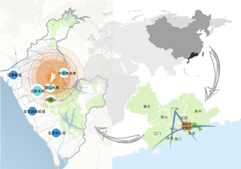 概念規(guī)劃范圍包含詳細設(shè)計范圍在內(nèi)的周圍關(guān)聯(lián)緊密地區(qū),用地約10平方公里,北至新玉路和外環(huán)高速,西至廣深高速,南至鳳凰第二工業(yè)區(qū),東部為包含“三庫一園”(屋山水庫、長流陂水庫、七瀝水庫及火山公園)在內(nèi)關(guān)聯(lián)緊密的自然山體、水等要素。