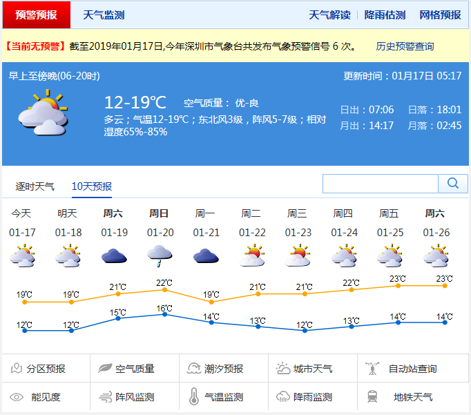 市氣象臺(tái)還發(fā)布2019年春運(yùn)天氣趨勢,預(yù)計(jì)今年春運(yùn)天氣影響與去年相當(dāng),未來45天有3次冷空氣過程,分別出現(xiàn)在1月21日、26日和2月1日 -2日前后,深圳最低氣溫10 ℃左右,天氣陰冷伴有大風(fēng),同期南方有階段性雨雪冰凍天氣。2月4日 -2月10日,無強(qiáng)冷空氣影響我市。