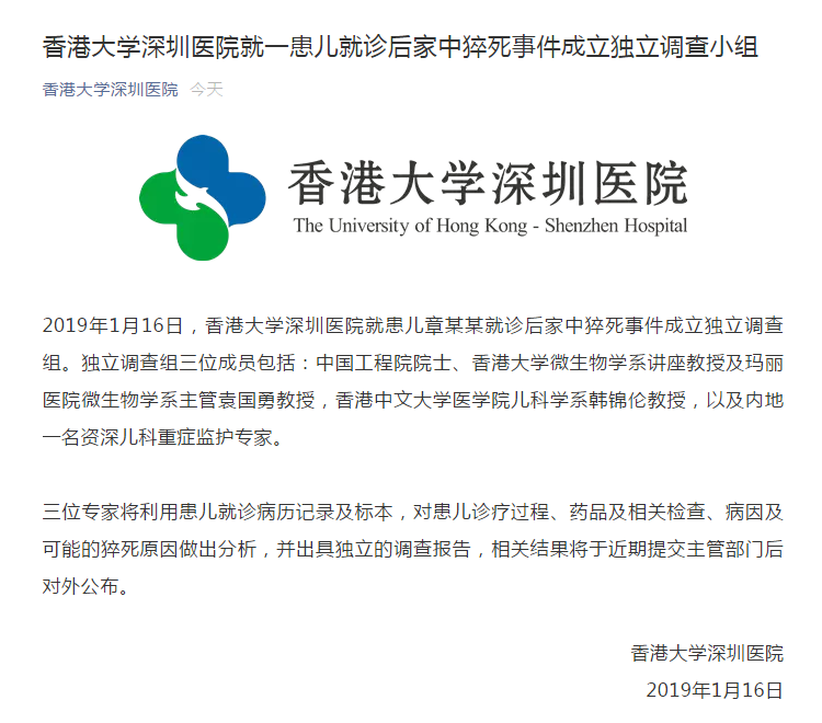 1月16日,香港大學(xué)深圳醫(yī)院就患兒章某某就診后家中猝死事件成立獨(dú)立調(diào)查組,待調(diào)查完畢后將把相關(guān)結(jié)果提交主管部門(mén)并對(duì)外公布。