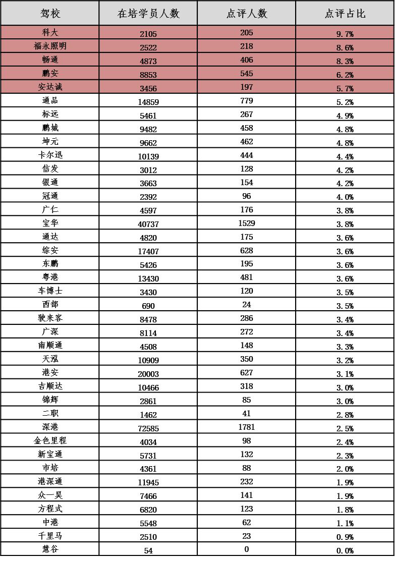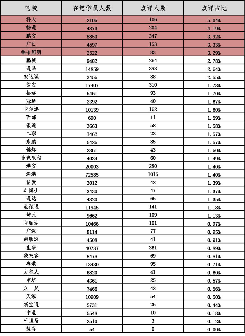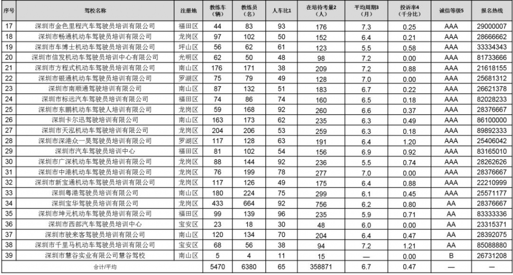 以下對(duì)深圳各駕校詳細(xì)信息進(jìn)行公布,市民可根據(jù)下表,選擇人車(chē)比和在培待考量相對(duì)較低、學(xué)車(chē)周期較短、投訴率較低、誠(chéng)信評(píng)價(jià)等級(jí)較高的駕校進(jìn)行培訓(xùn):