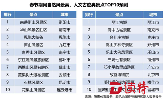 除了返鄉(xiāng)外,春節(jié)同樣是外出旅游的好時(shí)機(jī)。據(jù)《報(bào)告》預(yù)測,在全國259家5A級旅游景點(diǎn)中,南岳衡山風(fēng)景區(qū)、華山風(fēng)景名勝區(qū)、恩施大峽谷將排名最火爆自然風(fēng)景類景區(qū)前三,麗江古城、閬中古城景區(qū)、臺(tái)兒莊古城則是最具人氣的人文古跡類景區(qū)前三。