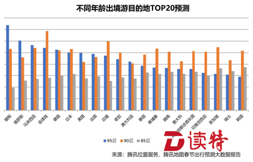 根據(jù)年齡劃分,18歲以下青少年最喜歡前往東南亞國家,而60歲以上老年人最青睞的是歐美發(fā)達(dá)國家。進(jìn)一步研究發(fā)現(xiàn),85后最愛去的國家是韓國、新加坡、瑞士、阿聯(lián)酋、越南,涵蓋東亞、東南亞和歐洲,90后最愛去的國家是菲律賓、印度、新加坡、馬來西亞、柬埔寨,全部在東南亞地區(qū),95后最愛去的國家是緬甸、俄羅斯、馬來西亞、菲律賓、德國,涵蓋東南亞和歐洲。