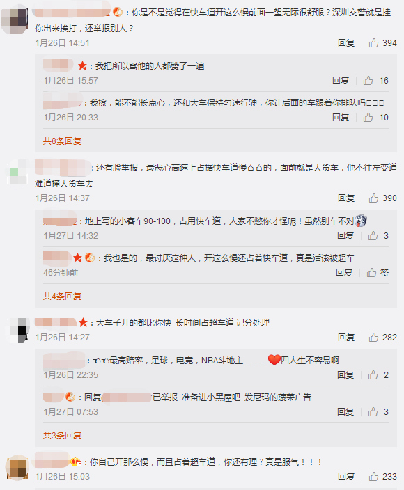 1月28日下午5點,深圳交警在微博上也給網(wǎng)友作出回復(fù),對于長時間龜速占用超車道的行為也將一并調(diào)查。