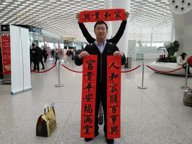 宋先生當(dāng)天10:50的飛機(jī)出發(fā)去上海再轉(zhuǎn)機(jī)回老家山東,他選擇了“人和家順百事興,富貴平安福滿堂”橫批“家和業(yè)興”,一個(gè)個(gè)“家”“安”“和”等字樣表達(dá)了他的新年愿望:希望家人平平安安。
