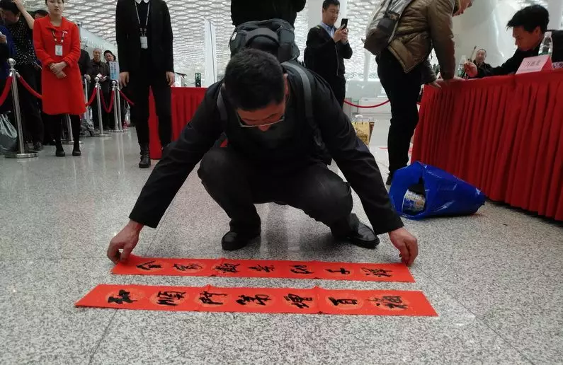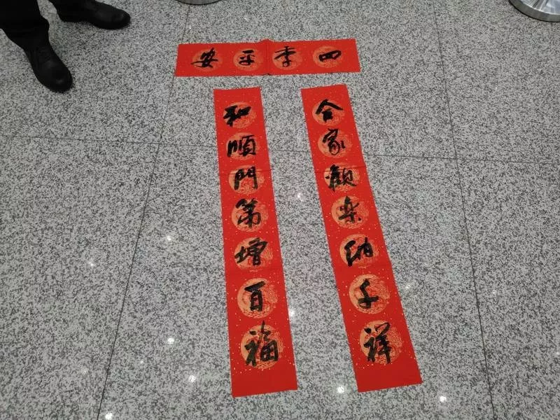 來自山東的譚先生剛從越南河內(nèi)務(wù)工回來,準備轉(zhuǎn)機回山東煙臺,他選擇了“合家歡樂納千祥,和順門第增百?!?表達了他對家庭美滿的祝福。