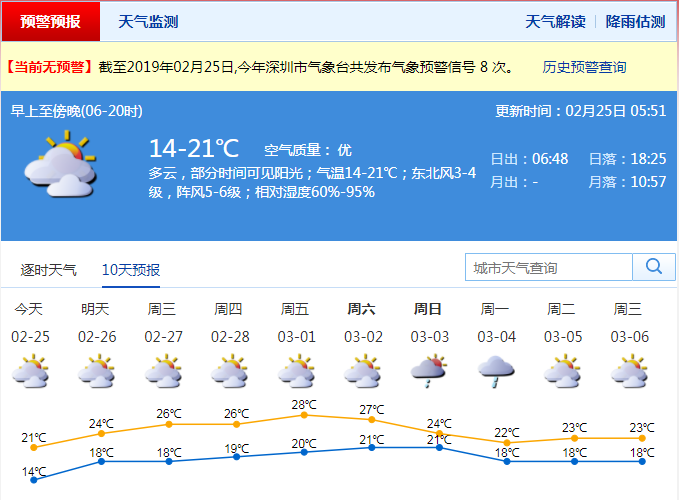 深圳新聞網(wǎng)2019年2月25日訊 記者從深圳市氣象局了解到,24日降雨結(jié)束,天色趨于明朗,白天最高氣溫18℃左右。預(yù)計(jì)25日起多云可見陽光,氣溫逐日回升,有輕霧或霾,轉(zhuǎn)溫暖濕潤(rùn)天氣。展望3月我市天氣偏暖,空氣潮濕,雨霧等低能見度天氣易發(fā)。3月仍有3-4次弱冷空氣影響,強(qiáng)度比本次冷空氣弱,但冷空氣活動(dòng)時(shí)氣溫都會(huì)比前日略降,并轉(zhuǎn)陰雨天氣。
