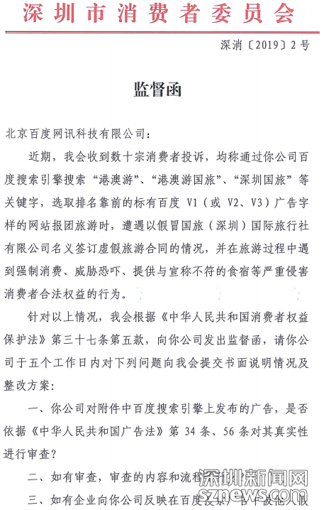 “野馬”旅行社屢禁不絕、愈演愈烈,不僅嚴(yán)重傷害了廣大消費者,傷害了合法企業(yè)的正當(dāng)經(jīng)營,傷害了公平有序的市場競爭秩序,也傷害了深圳的城市形象,這其中,百度難辭其咎。一些不法分子利用百度信譽(yù)V認(rèn)證的核查漏洞和競價排名規(guī)則,把百度作為招徠客源的廣告投放平臺,對消費者起到了極強(qiáng)的誤導(dǎo)作用。在此,深圳市消委會“三問百度”: