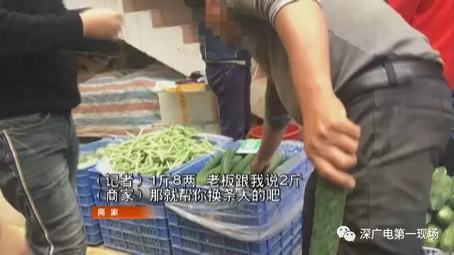 隨后,記者再次來到另外一家蔬菜攤檔,同樣選購了兩根黃瓜,商家稱重同樣顯示的是兩斤,不過當(dāng)記者把自己的便攜秤掏出來之后,商家這回給自己變了個戲法,說要給記者換條大的。