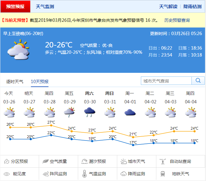 深圳新聞網(wǎng)2019年3月26日訊 今日深圳天氣多云,氣溫18-25℃,偏東風(fēng)3級(jí),相對濕度70%-95%。預(yù)計(jì)27-28日可見陽光,早晚有輕霧,氣溫逐日回升;29-31日冷空氣影響,深圳市轉(zhuǎn)陣雨或雷陣雨,氣溫下降,天氣轉(zhuǎn)涼。