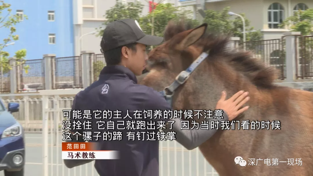 成年騾子路邊站崗是家養(yǎng)的,按照熱心市民留下的大概方位。記者在觀瀾街道庫坑社區(qū)平安路段終于看到了這個“稀客”的真容,只不過此時的它已經被套上了韁繩,服服帖帖的站在馬術教練旁邊。