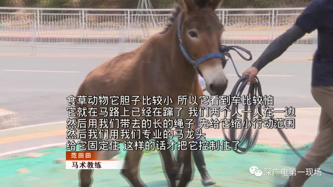 馴馬師馴騾子,終于安撫了焦慮情緒,所幸觀瀾山水田園馬場的工作人員在接到消息后立即趕到現場,及時安撫了已經處在焦躁邊緣的騾子。