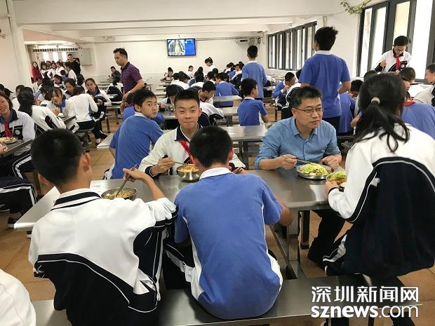 4月1日中午,深圳市福田區(qū)外國語學(xué)校校長丁長義跟學(xué)生一起在食堂就餐