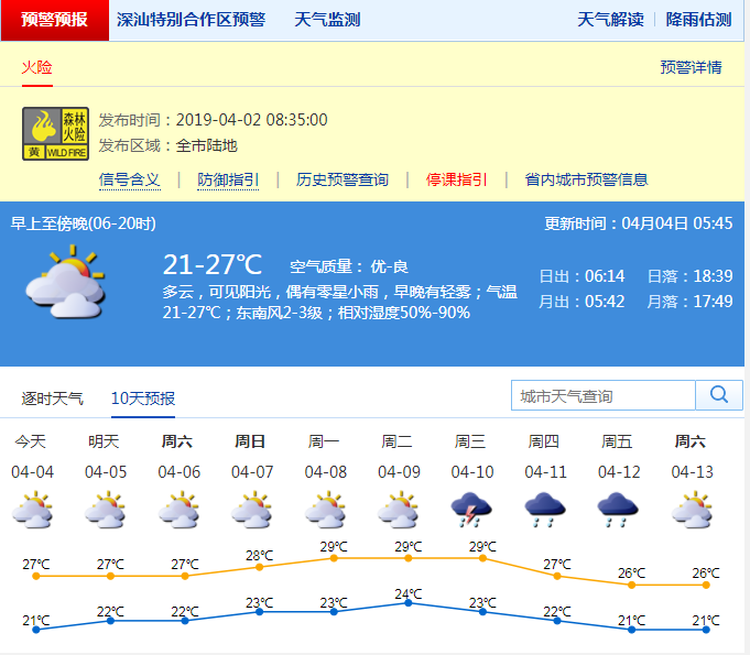 深圳新聞網(wǎng)2019年4月4日訊 今日到清明假期我市多云為主,降水偏少,氣溫較高,空氣較干燥。4-5日多云為主,可見陽光,偶有分散小雨,4日氣溫21-27℃;6-8日多云,中午前后較熱,早晚能見度較低。