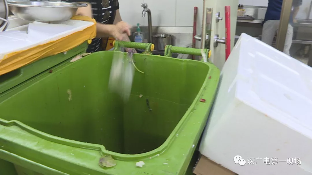在接下來(lái)的檢查中,執(zhí)法人員發(fā)現(xiàn),后廚操作間的過(guò)道放置了幾個(gè)大垃圾桶,裝滿(mǎn)了餐廚垃圾卻沒(méi)有加蓋。