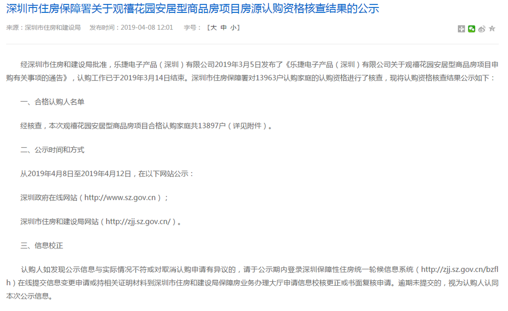 深圳新聞網(wǎng)2019年4月9日訊(記者 劉婷)記者從市住房保障署獲悉,觀禧花園安居型商品房項目認購工作已經(jīng)結(jié)束。經(jīng)核查,該項目合格認購家庭共13897戶,合格家庭名單自4月8日至4月12日在深圳政府在線和深圳市住房(http://www.sz.gov.cn)和建設(shè)局(http://zjj.sz.gov.cn/)網(wǎng)站公示。