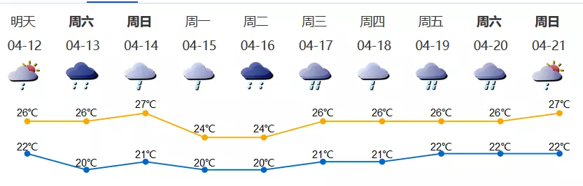 13日有陣雨,部分時間雨勢較大,氣溫20-26℃;14日有小雨到中雨,氣溫21-27℃;15-16日天氣仍不穩(wěn)定。