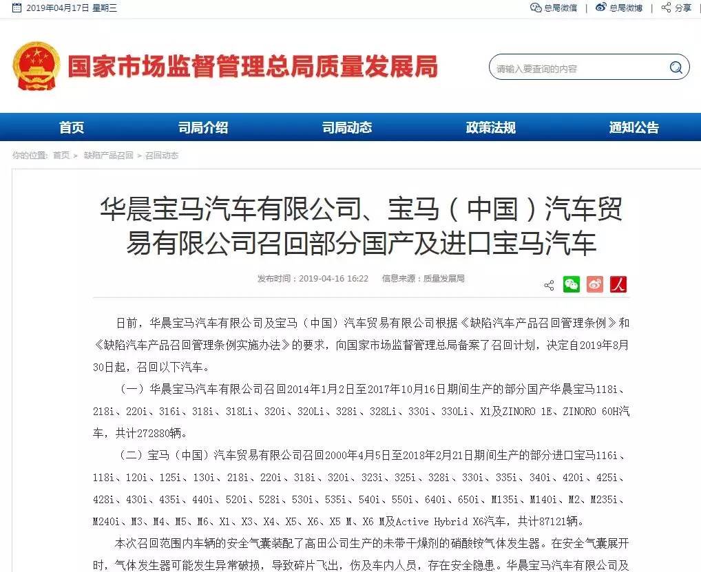 華晨寶馬汽車有限公司召回2014年1月2日至2017年10月16日期間生產(chǎn)的部分國產(chǎn)華晨寶馬118i、218i、220i、316i、318i、318Li、320i、320Li、328i、328Li、330i、330Li、X1及ZINORO1E、ZINORO60H汽車,共計272880輛。