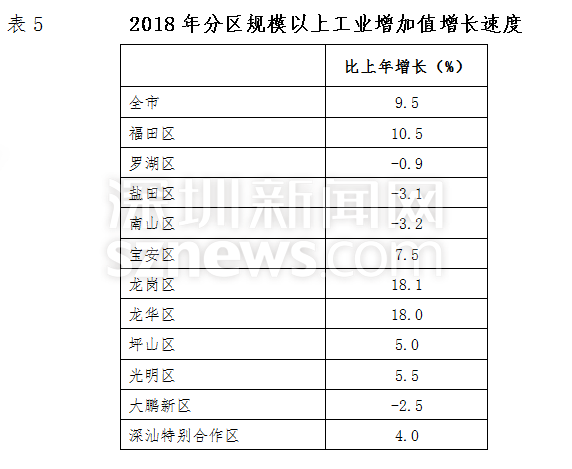 2018年,深圳全部工業(yè)增加值9254.00億元,比上年增長9.0%。規(guī)模以上工業(yè)增加值增長9.5%。在規(guī)模以上工業(yè)中,國有企業(yè)增加值下降21.4%;集體企業(yè)下降5.6%;股份制企業(yè)增長12.8%;外商及港澳臺商投資企業(yè)增長3.8%。分輕重工業(yè)看,輕工業(yè)增加值增長6.2%;重工業(yè)增加值增長10.2%。