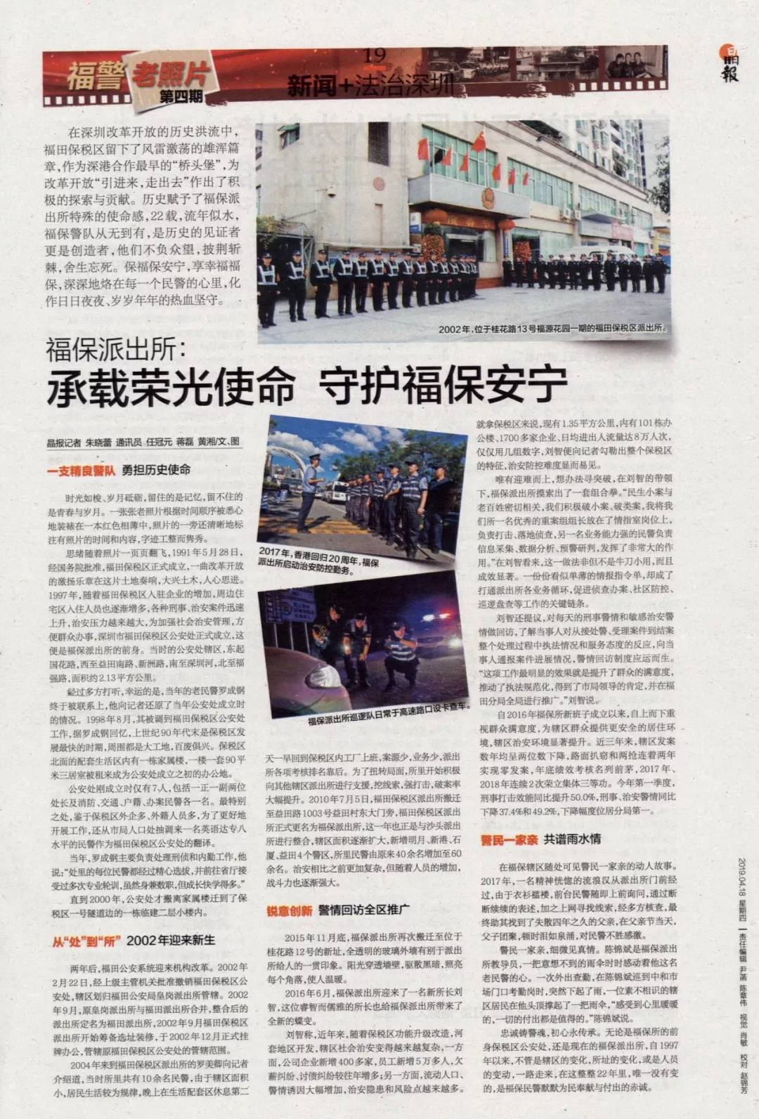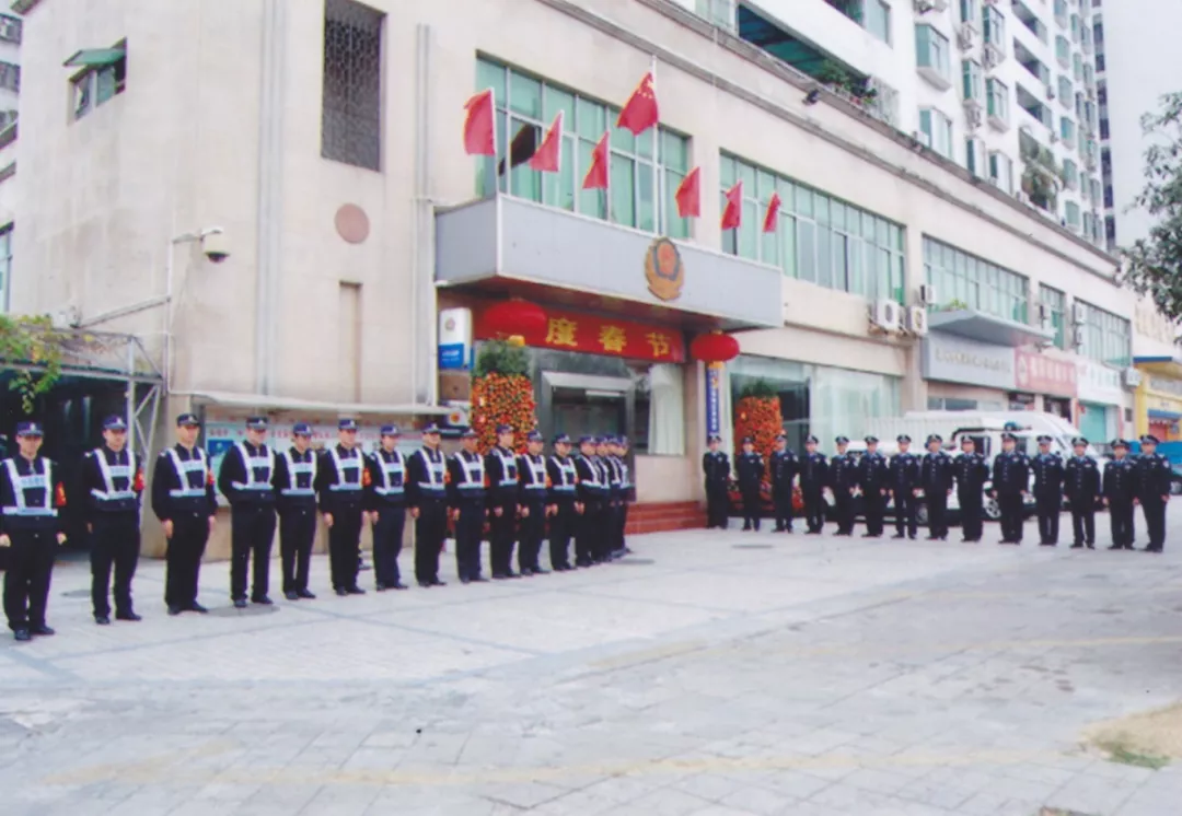 思緒隨著照片一頁頁翻飛,1991年5月28日,經(jīng)國務院批準,福田保稅區(qū)正式成立,一曲改革開放的激揚樂章在這片土地奏響,大興土木,人心思進。1997年,隨著福田保稅區(qū)入駐企業(yè)的增加,周邊住宅區(qū)入住人員也逐漸增多,各種刑事、治安案件迅速上升,治安壓力越來越大,為加強社會治安管理,方便群眾辦事,深圳市福田保稅區(qū)公安處正式成立,這便是福保派出所的前身。當時的公安處轄區(qū),東起國花路,西至益田南路、新洲路,南至深圳河,北至福強路,面積約2.13平方公里。