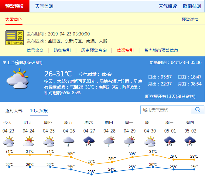 深圳新聞網(wǎng)2019年4月23日訊 深圳市氣象局預計23日多云,大部分時間可見陽光,中午前后天氣悶熱,局地有短時陣雨,早晚有輕霧或霧;25-31℃;輕微南風;濕度65%-85%。24-25日多云局地有短時陣雨,中午較熱;26日起天氣趨于不穩(wěn)定。
