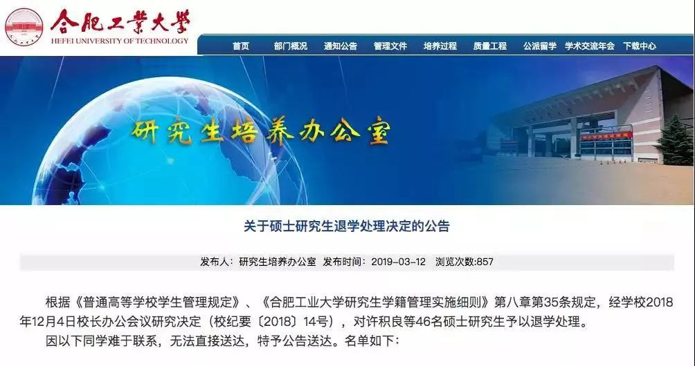 對46名碩士研究生予以退學處理,因其在學校規(guī)定的最長學習年限內未完成學業(yè),或超過學校規(guī)定期限未注冊而又無正當理由,且未經(jīng)請假離校連續(xù)兩周未參加學校的教學活動。